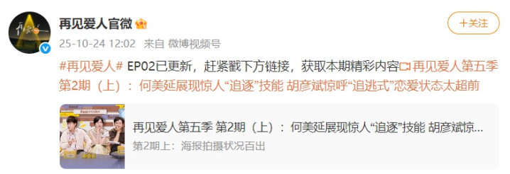 24日中午,《再见爱人》官微更新第二期节目动态。
